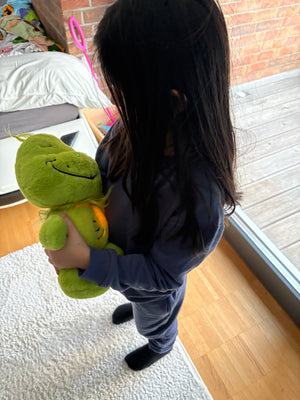 Mit 25–30 cm Höhe etwa so groß wie ein klassisches Kinderkissen oder ein Teddy, der genau in den Arm passt. Nicht zu groß, nicht zu klein – genau richtig zum Einschlafen. Die Hasen mit Reisverschlüssen sind jeweils 37cm (Hupsi) und 32cm (Hopsi).